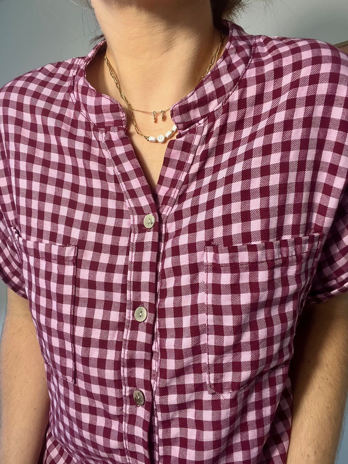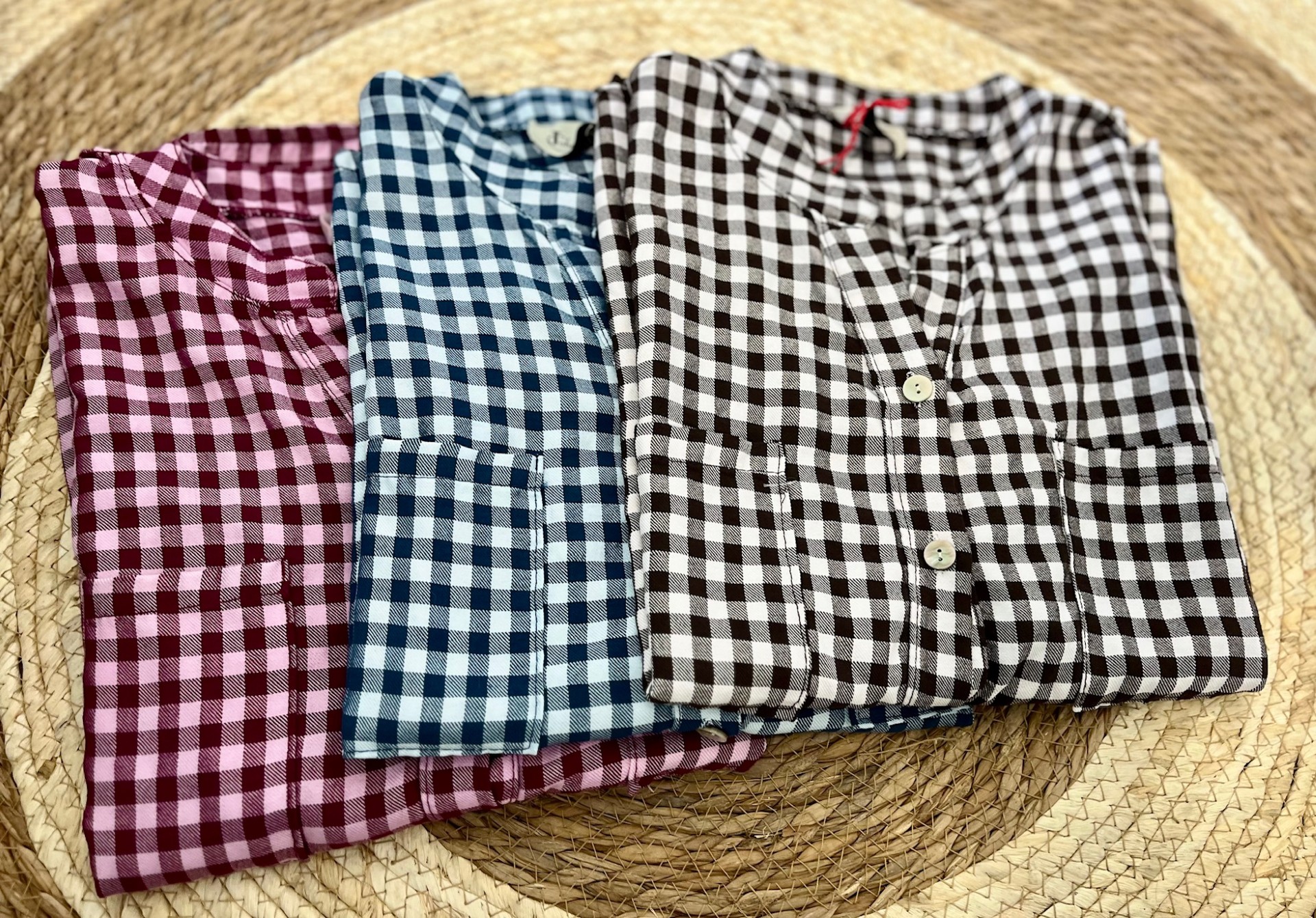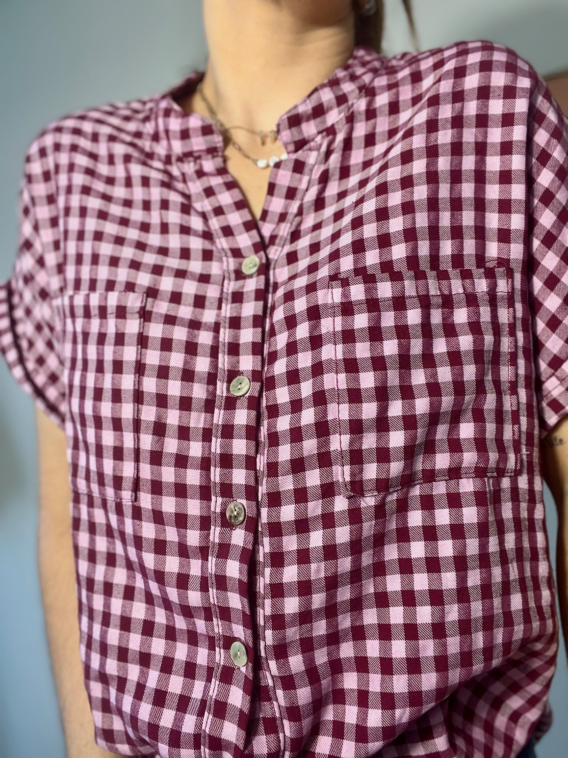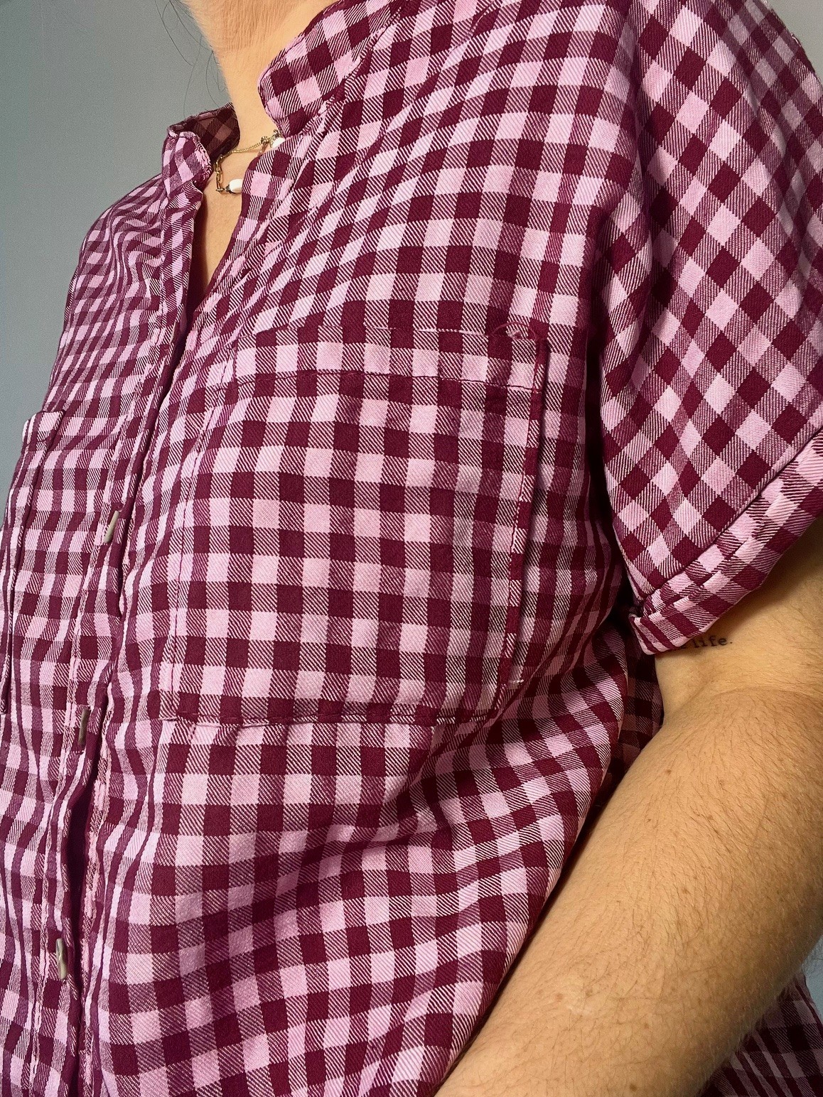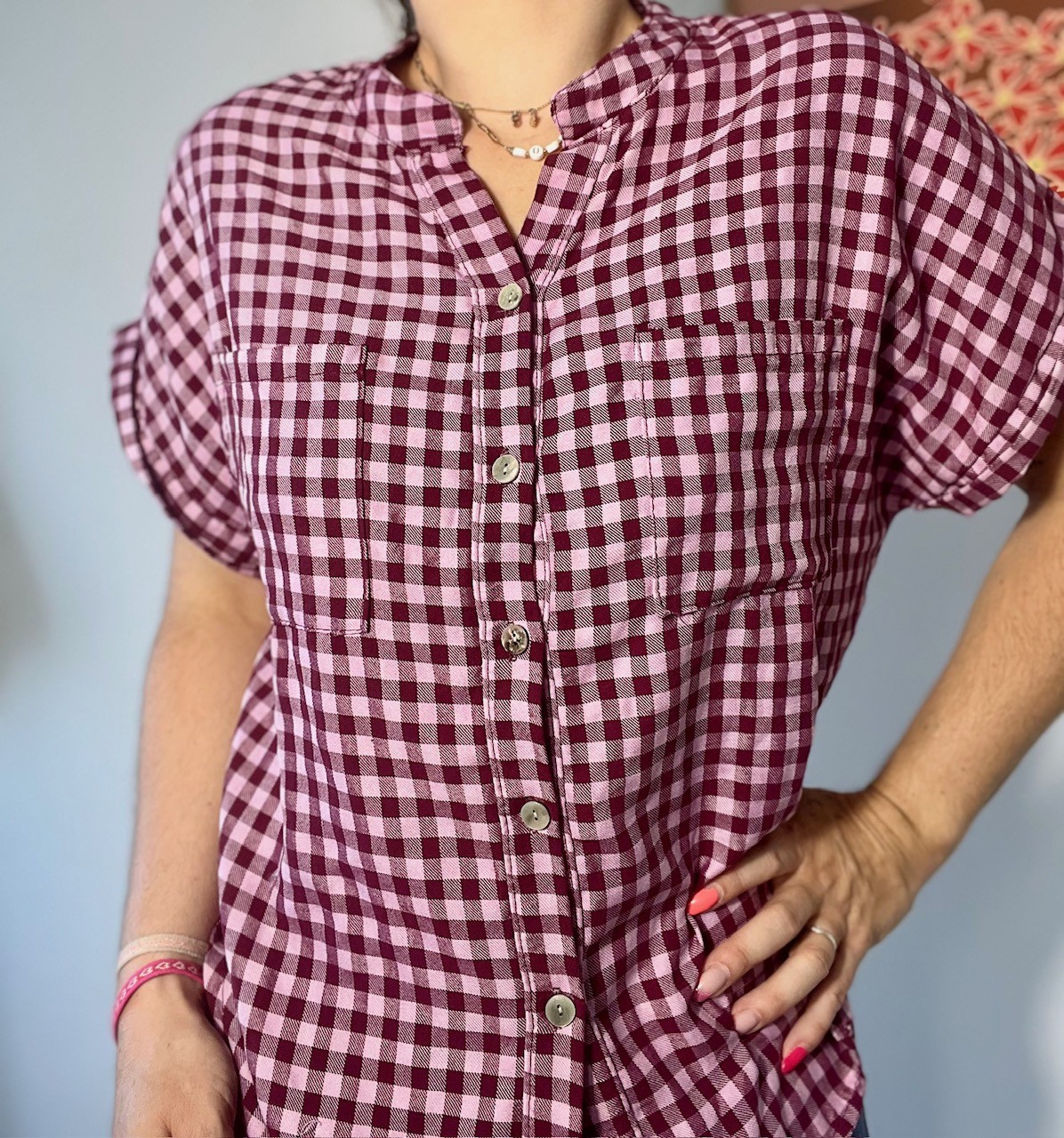 Chemise à carreaux Johanna, manches courtes, col tunisien et poches poitrine. Coupe fluide, tissu doux et léger. Disponible en bleu, marron et bordeaux.