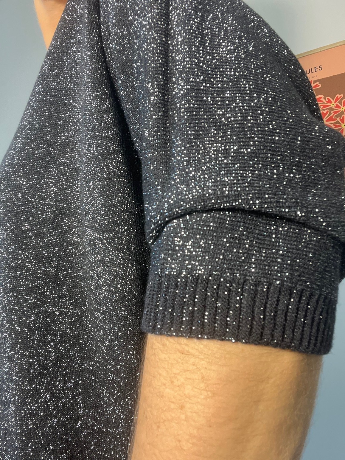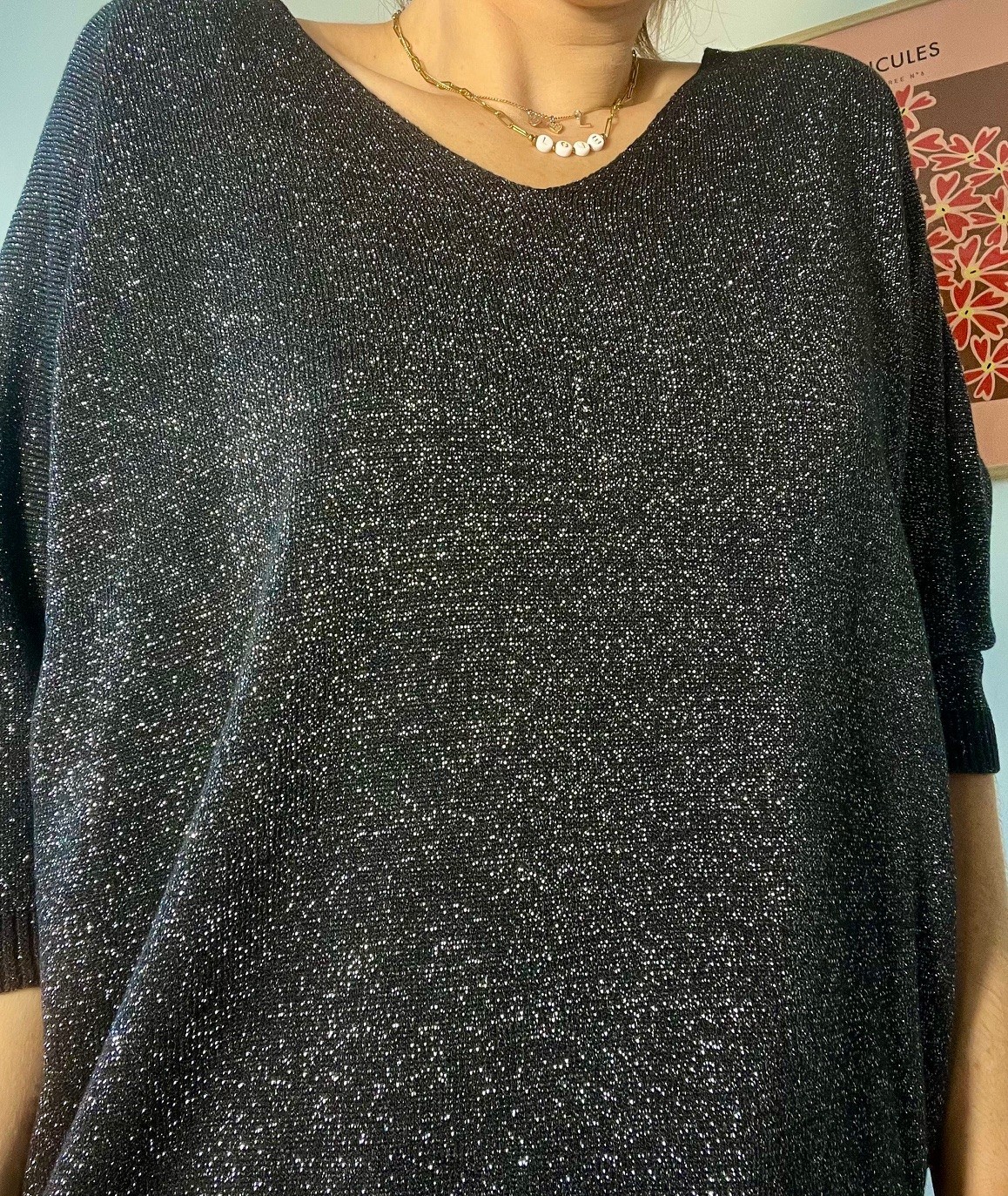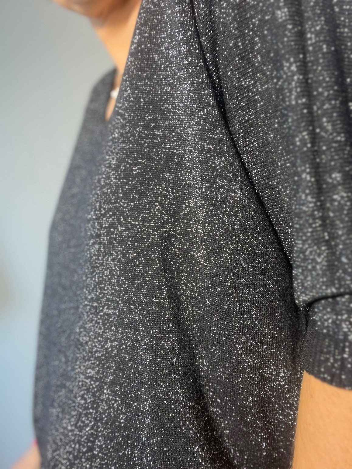 Pull fin à manches mi-longues, confection italienne. Son fil scintillant apporte une touche glamour à vos tenues, tout en restant confortable.