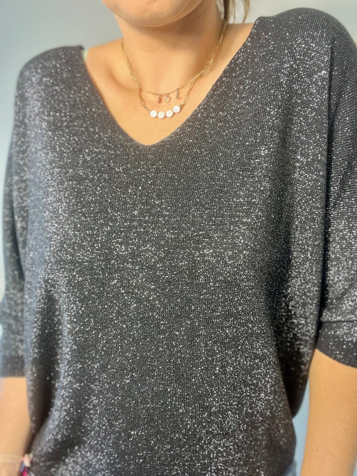 Brillez avec élégance grâce à ce pull fin femme à manches mi-longues au col V féminin et au fil scintillant subtil.
