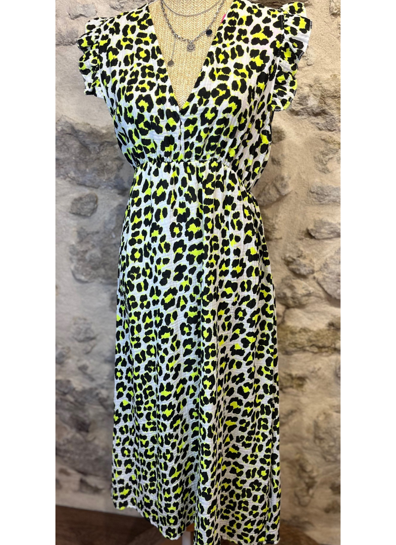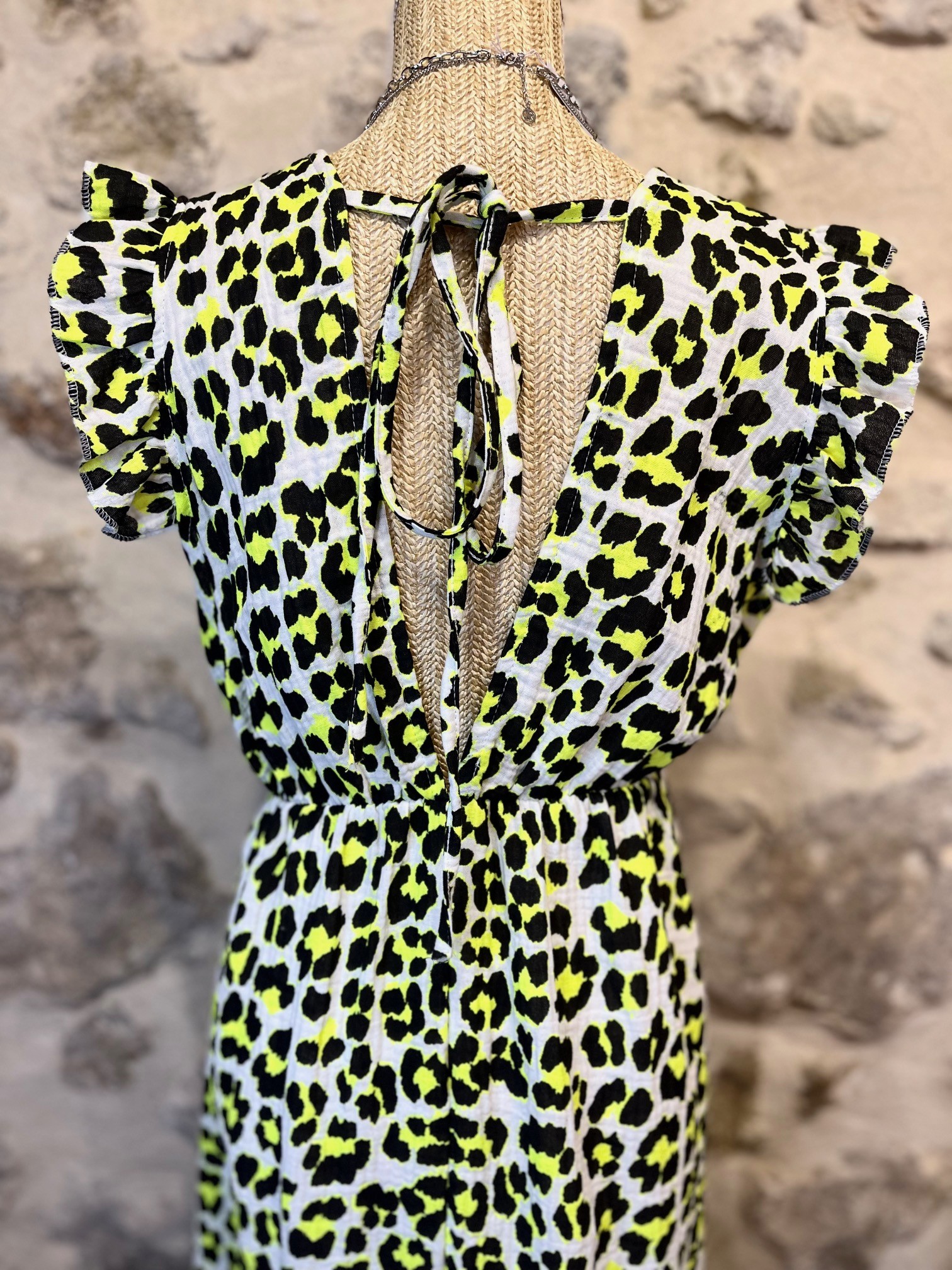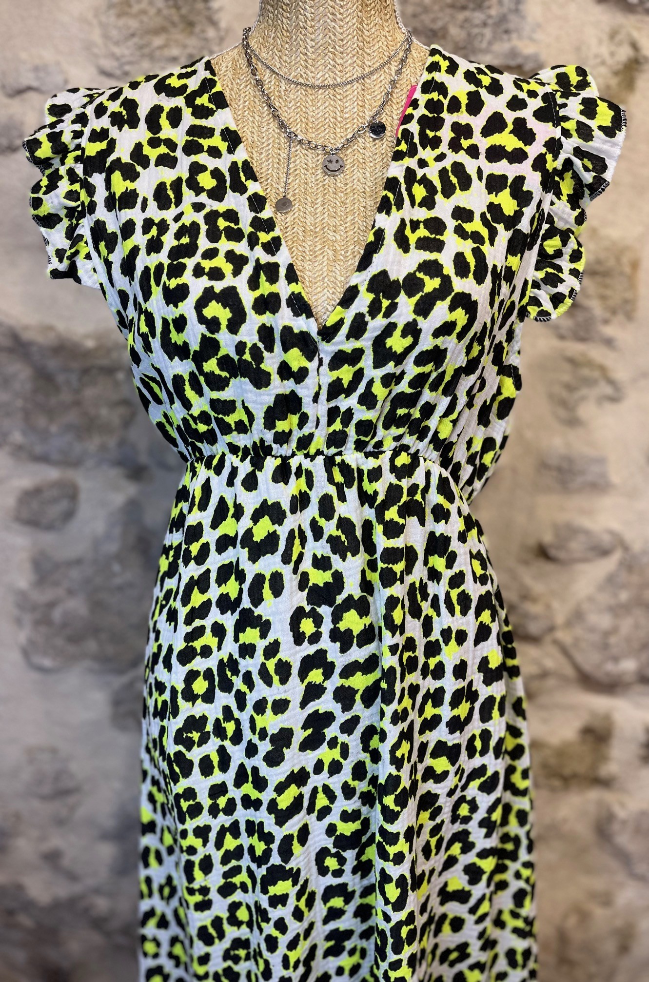 Craquez pour cette robe en gaze de coton ultra légère au motif léopard jaune fluo ! Une coupe fluide, un décolleté féminin et des volants délicats pour un look à la fois audacieux et confortable.