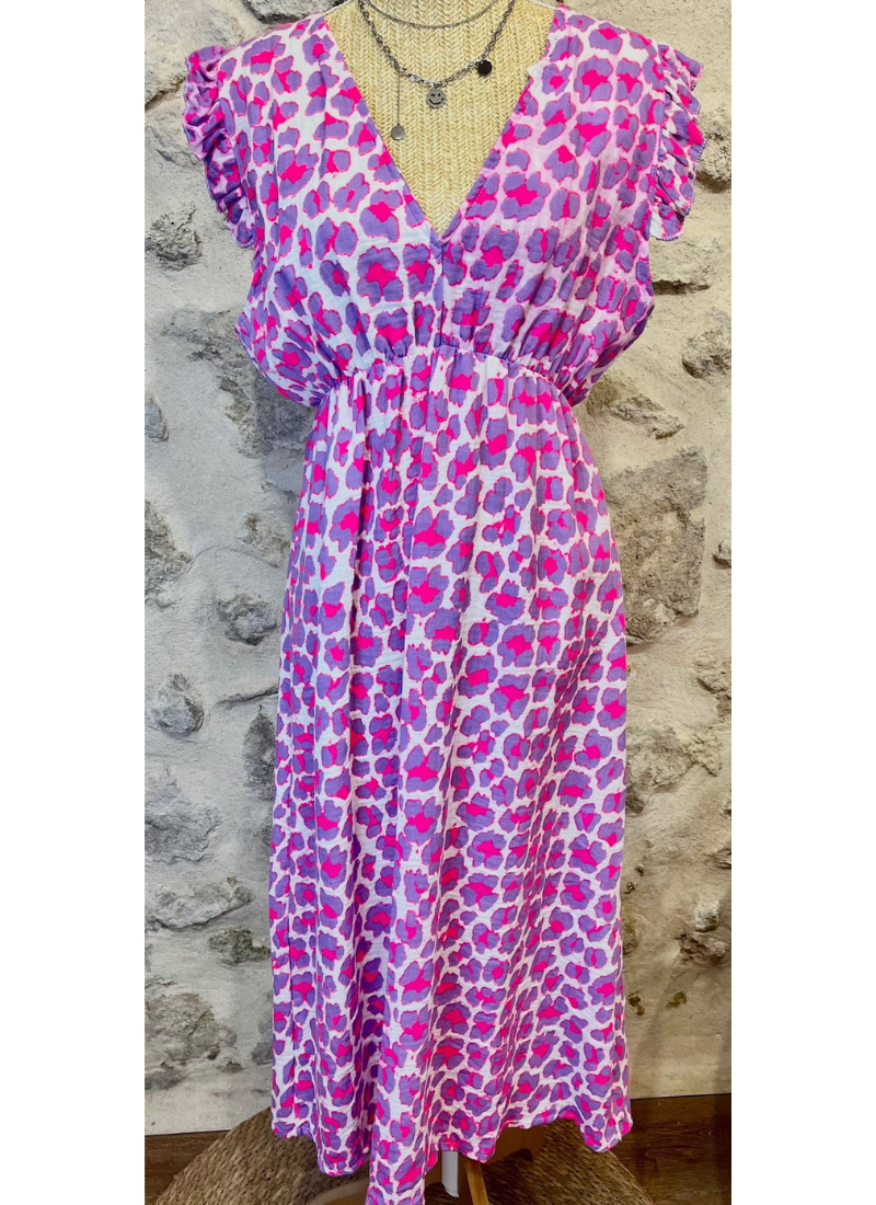 Laissez-vous séduire par notre magnifique robe longue en gaze de coton, à la fois féminine, légère et tendance. Son imprimé léopard revisité en tons rose fuchsia et violet offre un look audacieux et estival, idéal pour affirmer votre style avec élégance.