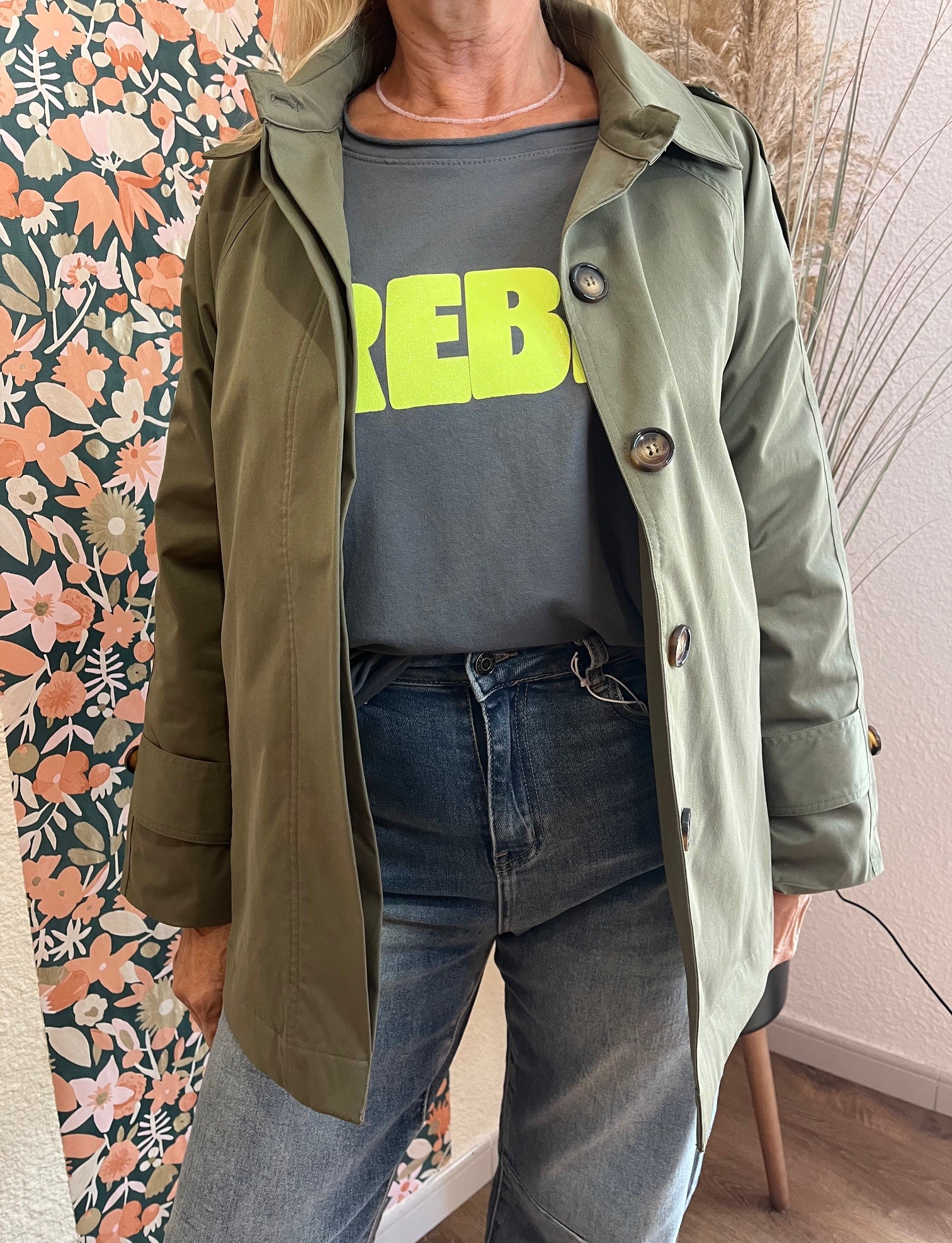 Tee-shirt sweat femme gris avec inscription fluo « REBEL ». Confortable en coton extensible, coupe ample et manches 3/4. Un t-shirt tendance et casual pour un look moderne.