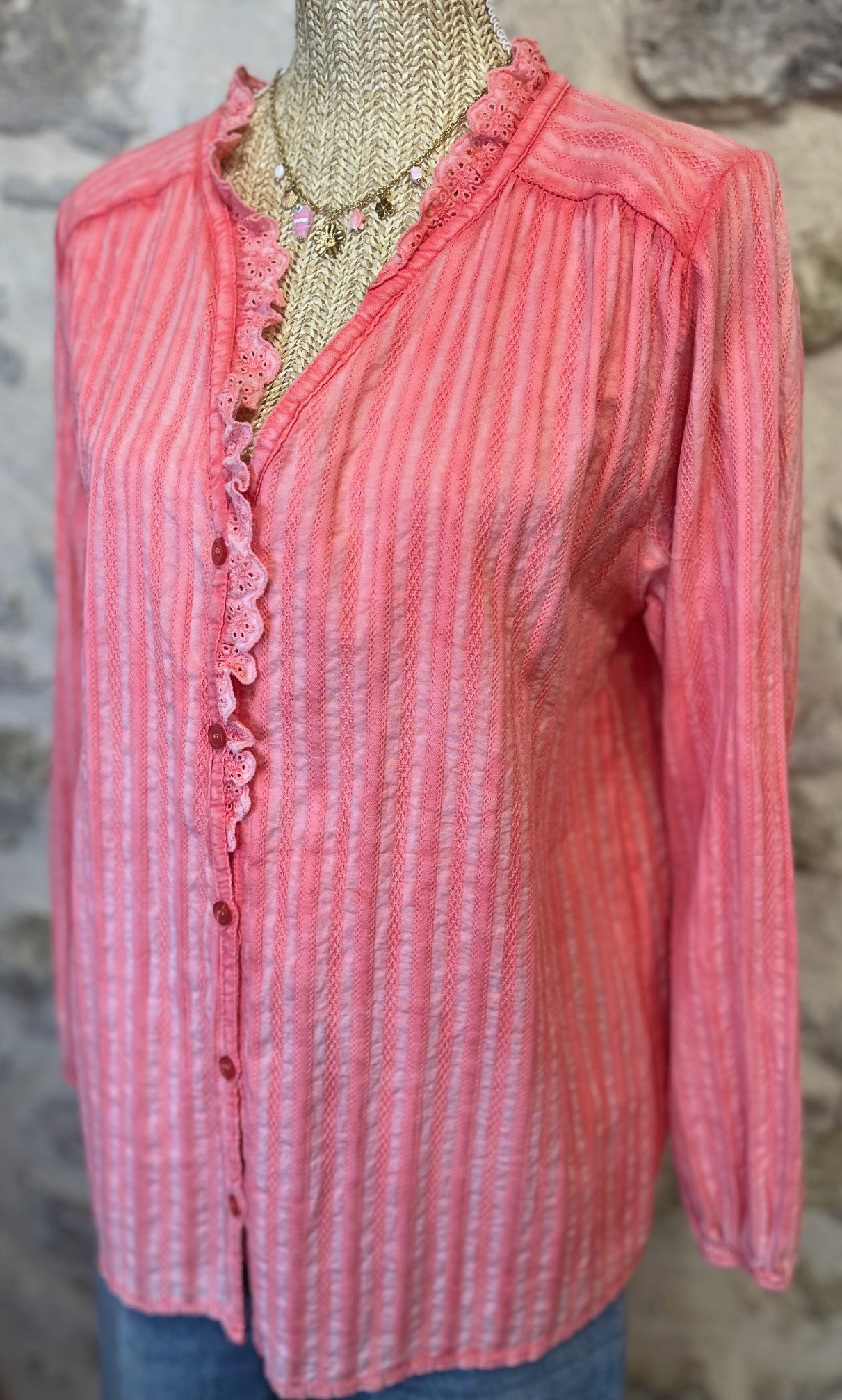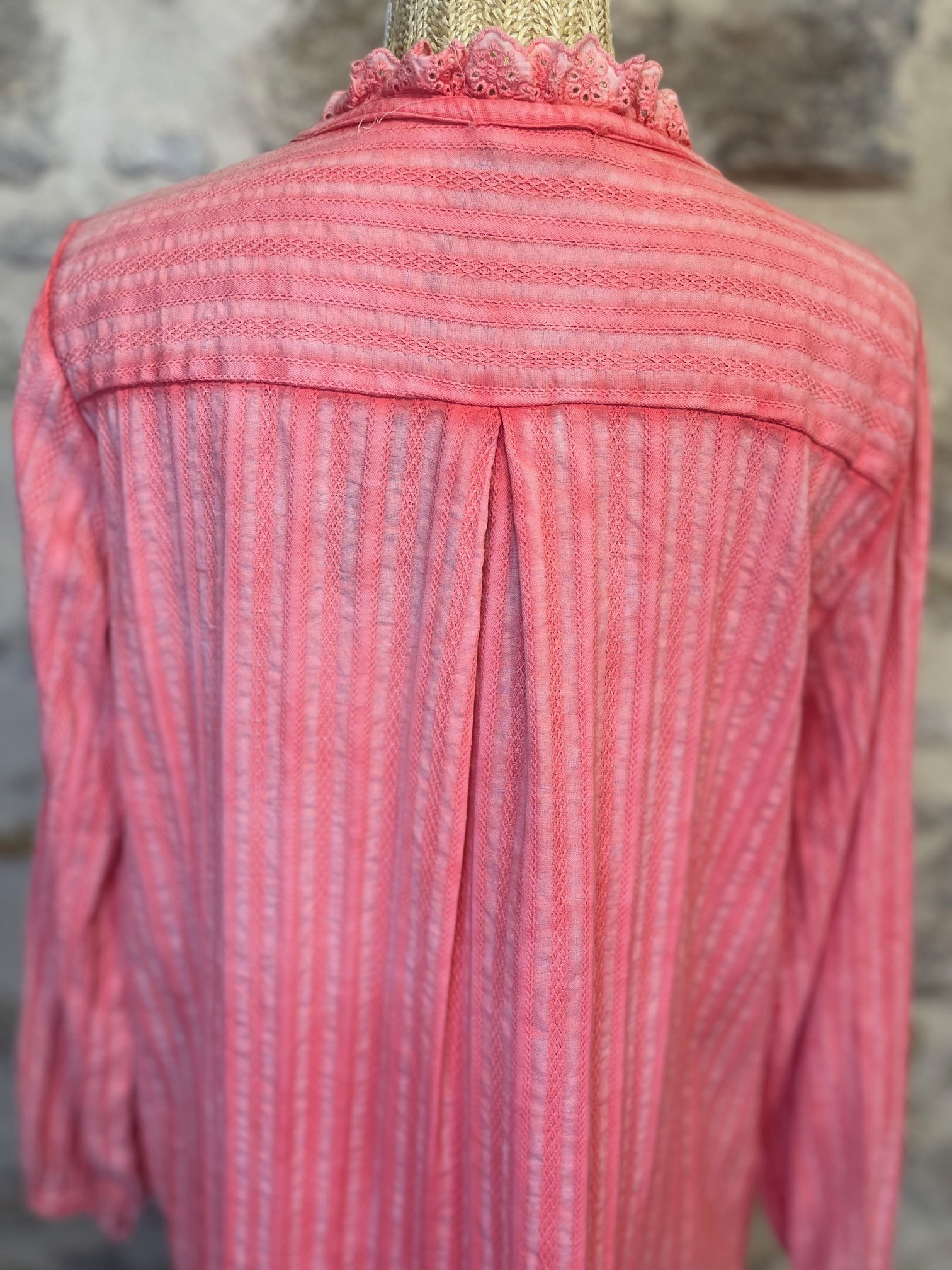 Confectionnée dans une matière légère et texturée, elle présente de délicats détails en dentelle brodée le long du col et de la patte de boutonnage. Ses manches longues, légèrement froncées aux épaules, ajoutent une touche de féminité subtile.