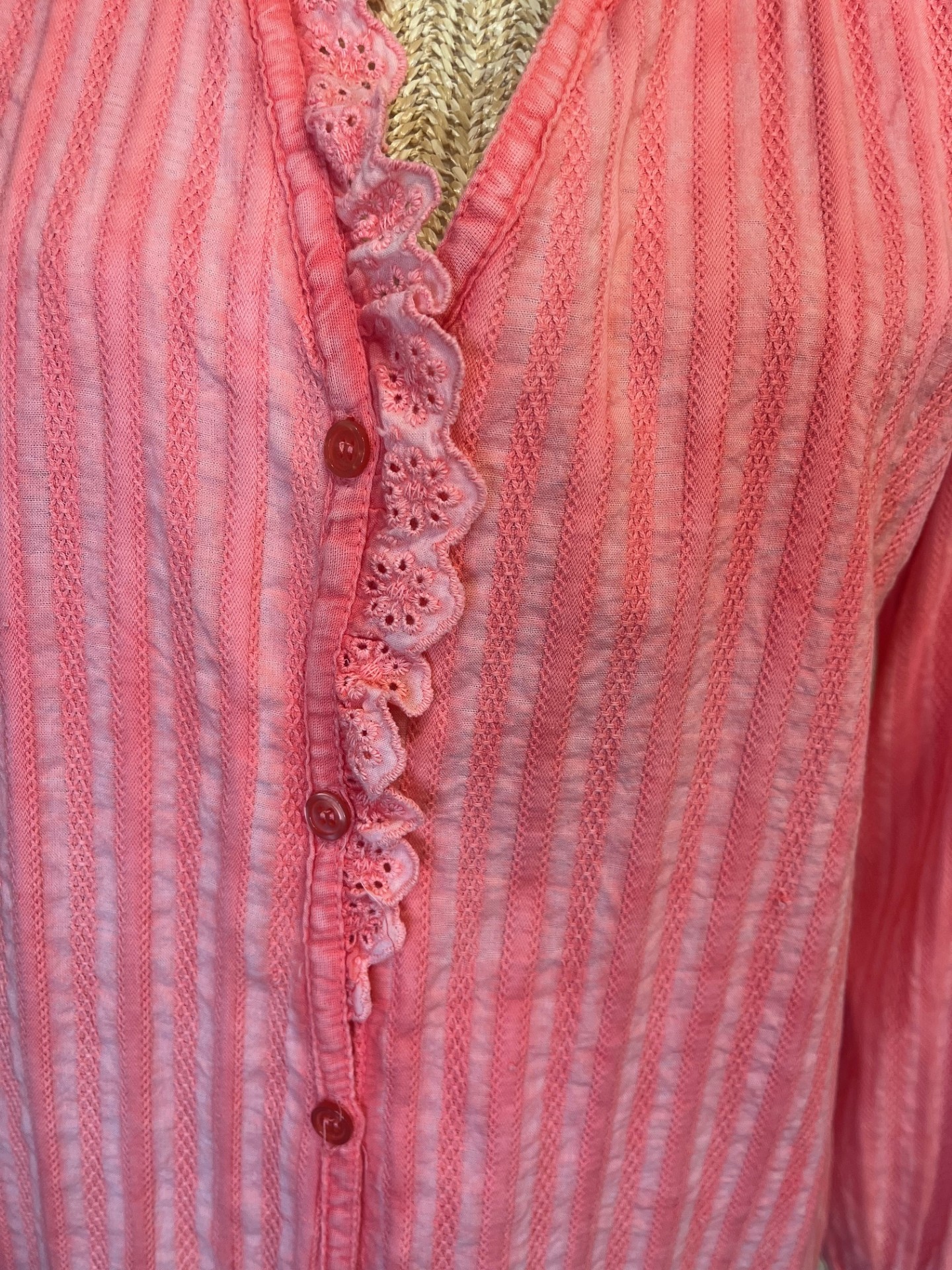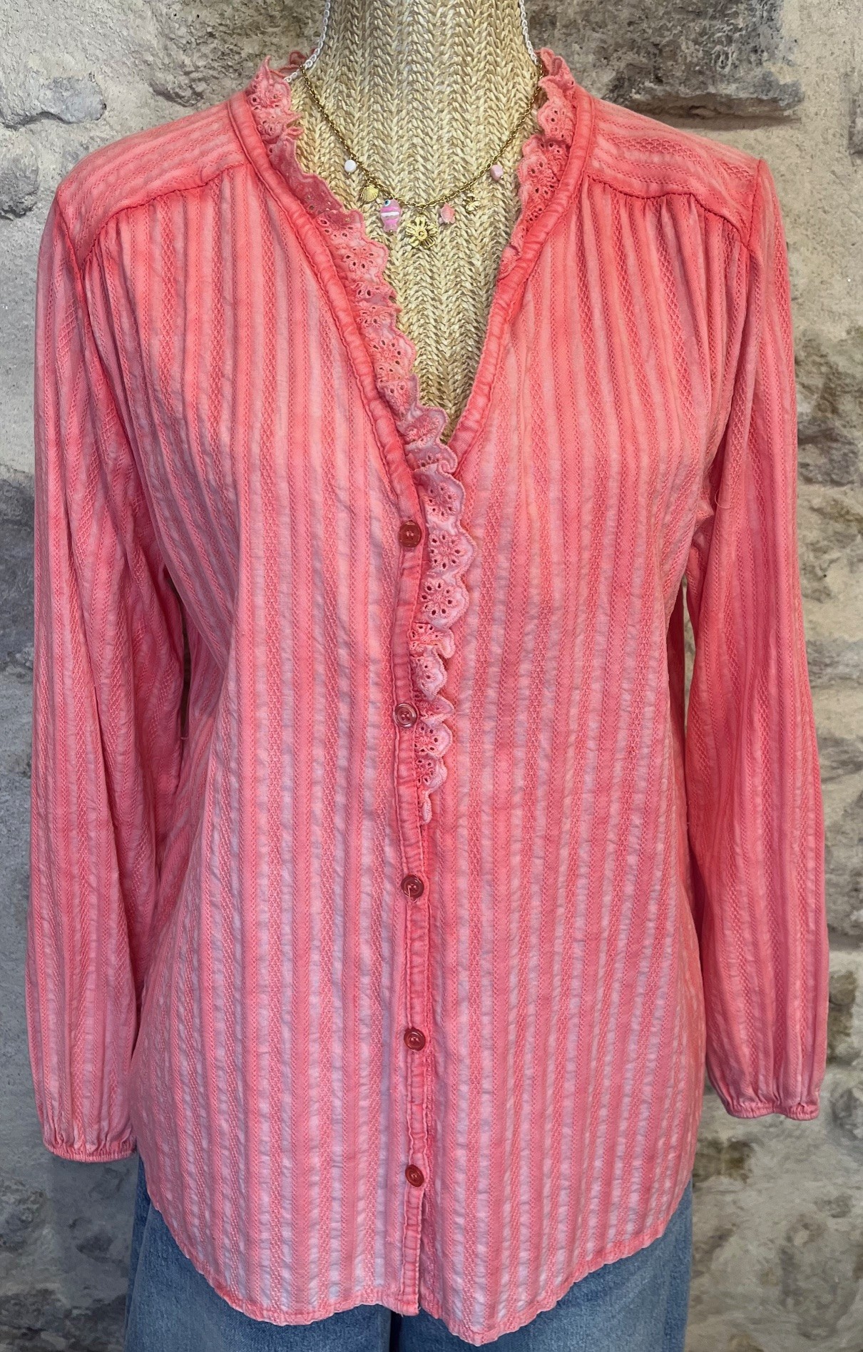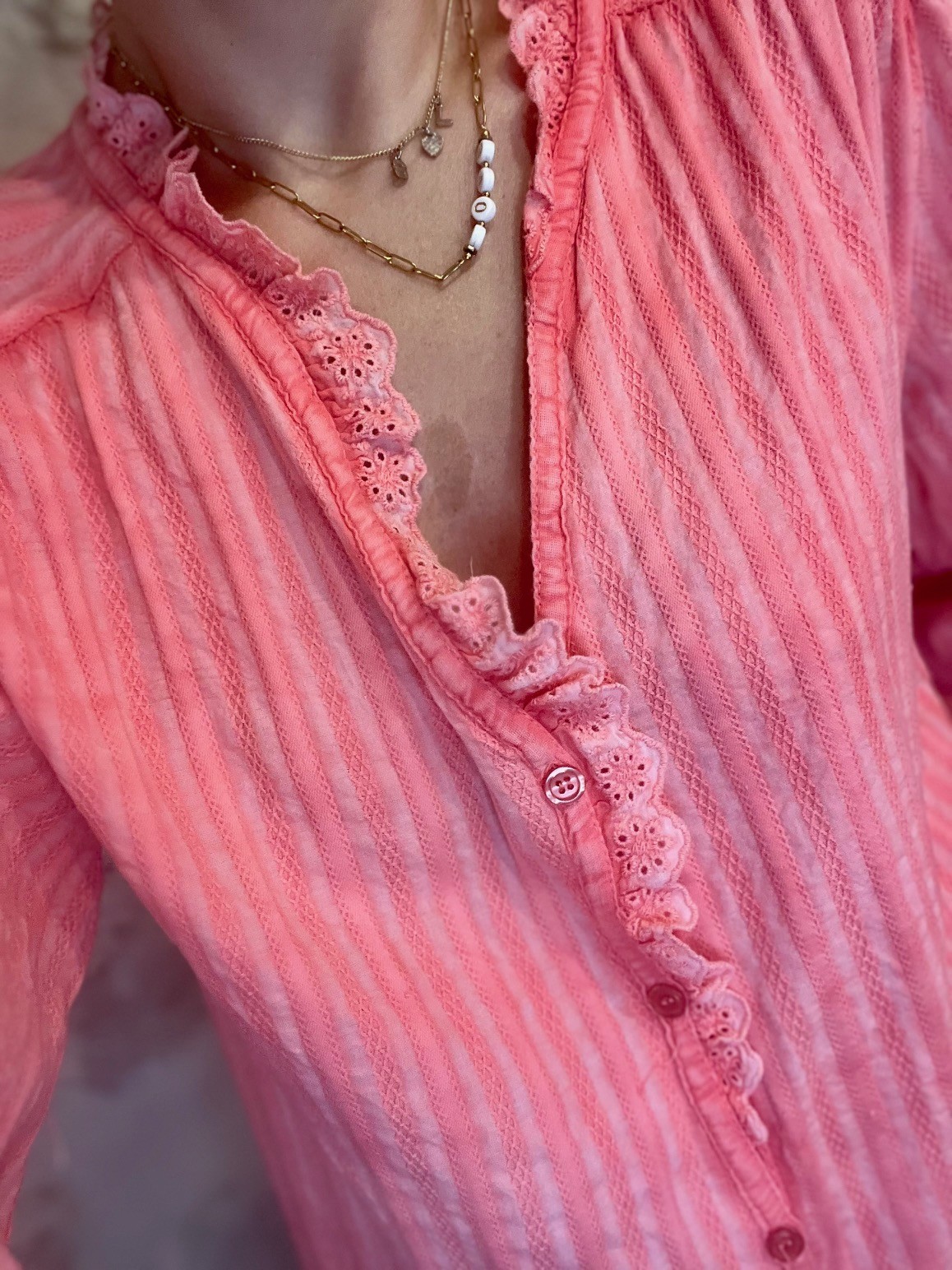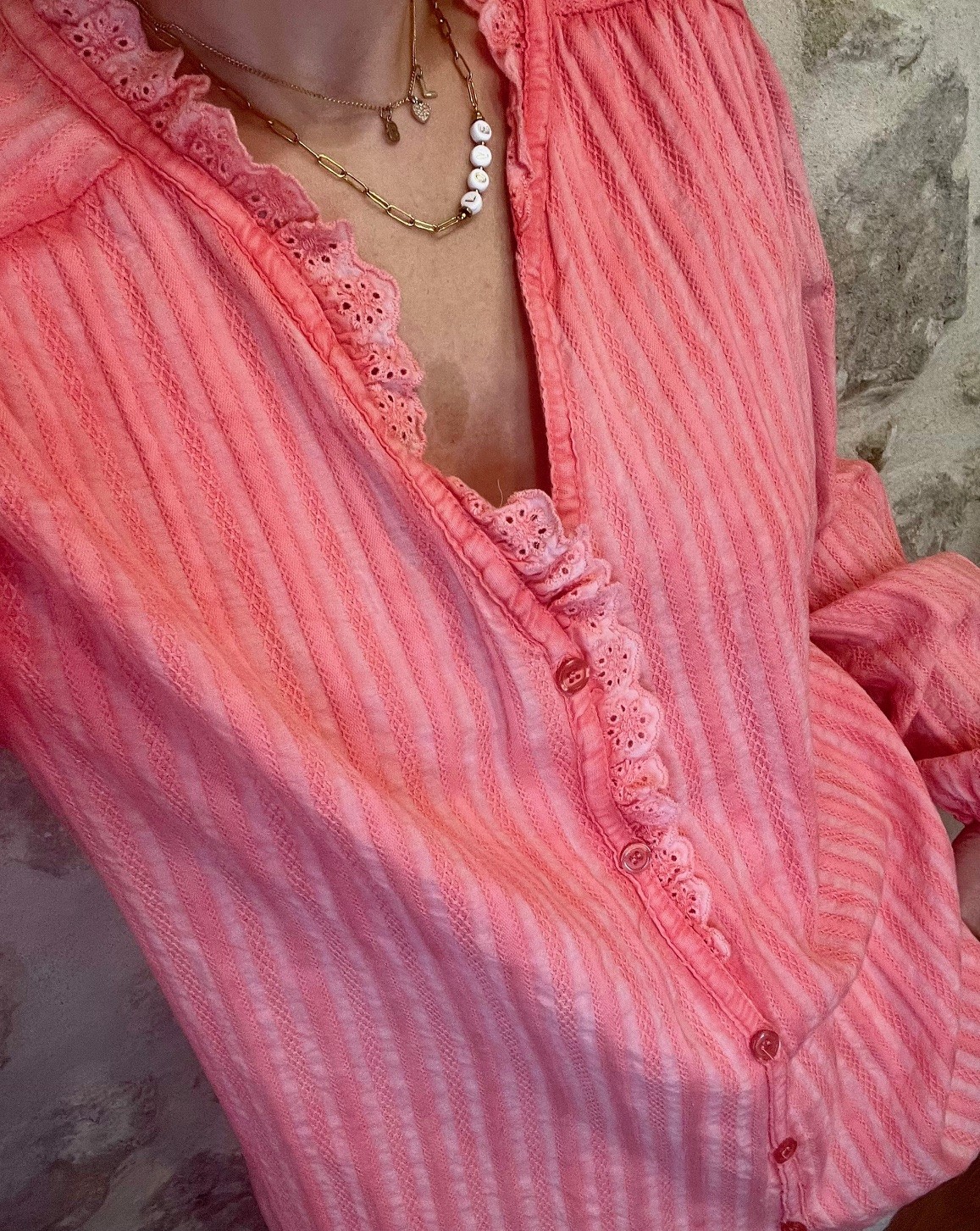 Tunique corail ZAPA en tissu léger avec détails en dentelle brodée et boutonnage sur le devant. Élégante et féminine, parfaite pour un look chic et estival.